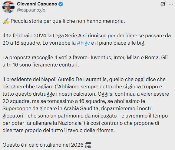 那不勒斯主席奥雷里奥·德劳伦蒂斯,就是今天说“应该缩减联赛”的人(“我们一直说比赛太多,这会摧毁我们的球员。今天大家还想保持20支球队,但如果回到16支球队,如果取消在沙特阿拉伯进行的超级杯比赛,我们就能保护我们的球员——这些球员是我们投入的资产——并且有时间让国家队训练”),他反对得非常坚决,甚至提议完全不参与改革讨论