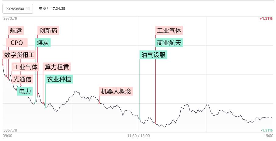 财联社4月3日讯,今日36股涨停,12股炸板,封板率为75%,津药药业6连板,新能泰山9天7板,汇源通信、重药控股2连板,苏利股份6天3板。市场全天震荡调整,三大指数高开低走,沪指再度跌破3900点关口。大小指数分化明显,微盘股指数跌超3.5%。沪深两市成交额1.66万亿,较上一个交易日缩量1865亿。盘面上,市场热点较为杂乱,全市场超4700只个股下跌。板块方面,CPO、跨境支付、光刻机板块涨幅靠前;体育、煤炭、农业、化工板块跌幅靠前。截至收盘,沪指跌1%,深成指跌0.99%,创业板指跌0.73%。