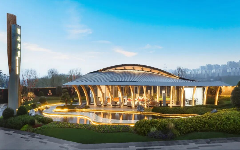 美学生活馆以沉浸式实景体验为核心,匠筑现代东方美学场域。200㎡美学建筑与2800㎡开阔草坪、静谧镜面水景相映成趣,以简约木纹构架立序城市封面。室内借景入室,「归巢」吊灯呼应山河意趣,让宋式风雅底蕴与现代雅奢质感完美交融。