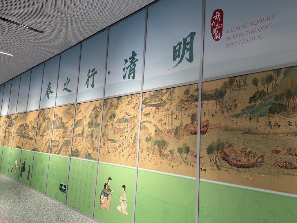展览选择了明代著名画家仇英的《清明上河图》高清图铺满墙面。这幅图以明代苏州城为原型,色彩明快、场景鲜活,成为展览的核心亮点,生动还原了古代清明的欢乐图景。