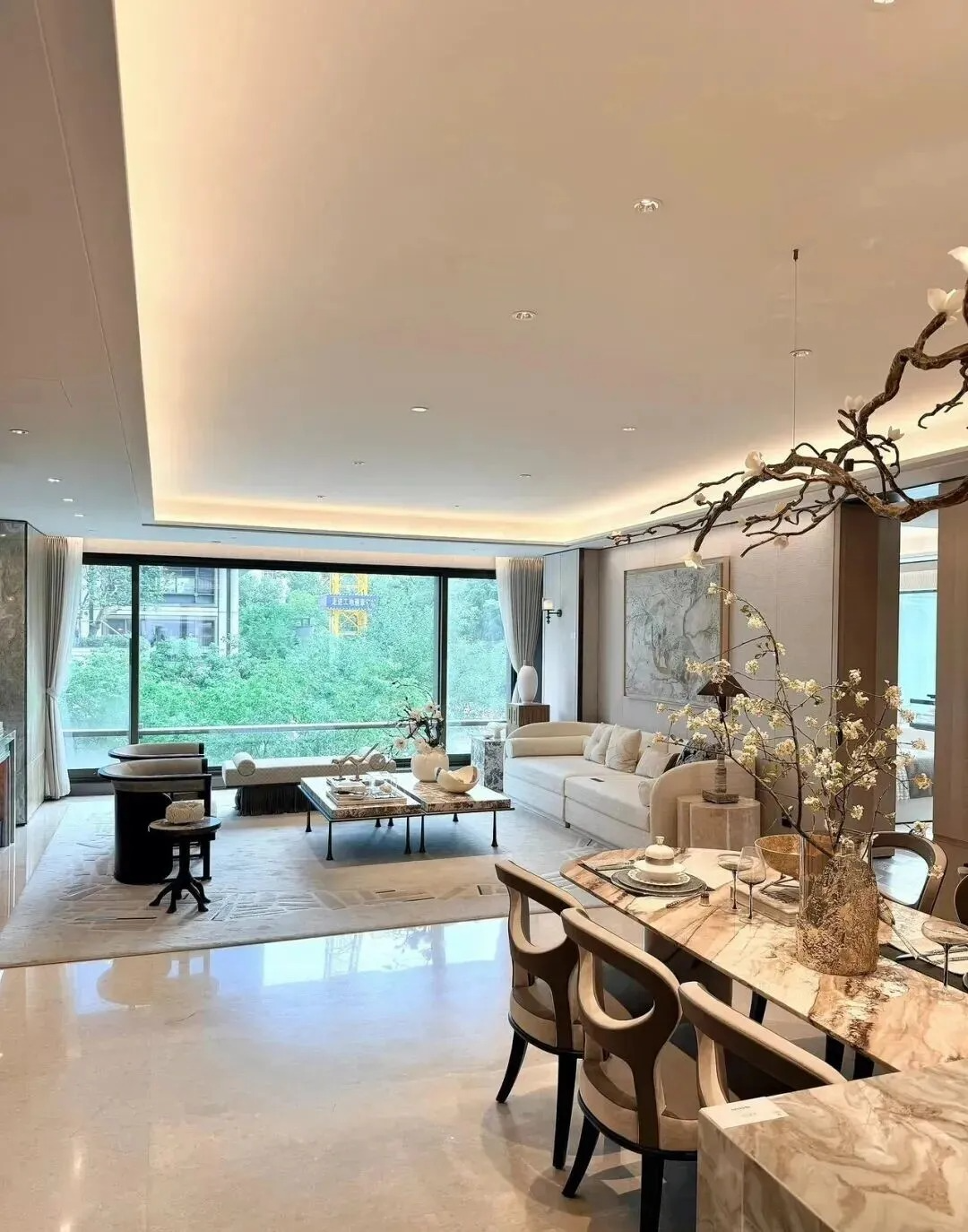这个户型,是西边套的设计,做到了 270 度的转角窗,整个户型的采光和视野,都做到了极致,在家里面,就可以 270 度俯瞰老静安的城市景观,看到梧桐林荫道,看到静安寺的摩天大楼,这样的视野,真的是太赞了。