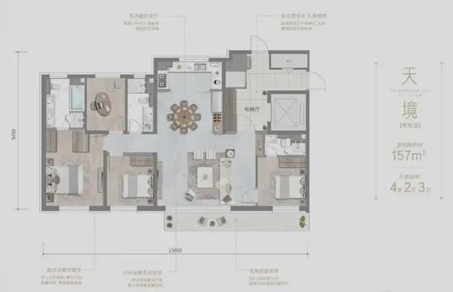 157㎡南北四居,户型方正,也依然是大客厅、短面宽格局,整个南向面宽达到了15.8米,进深8.95米。南向四面宽,三个卧室加一个大客厅。在当下市场实属罕见。分布于7# ,2梯2户,总楼层26F。有样板间,全落地窗设计、独立入户电梯厅、双套房设计、主卧步入式衣帽间。