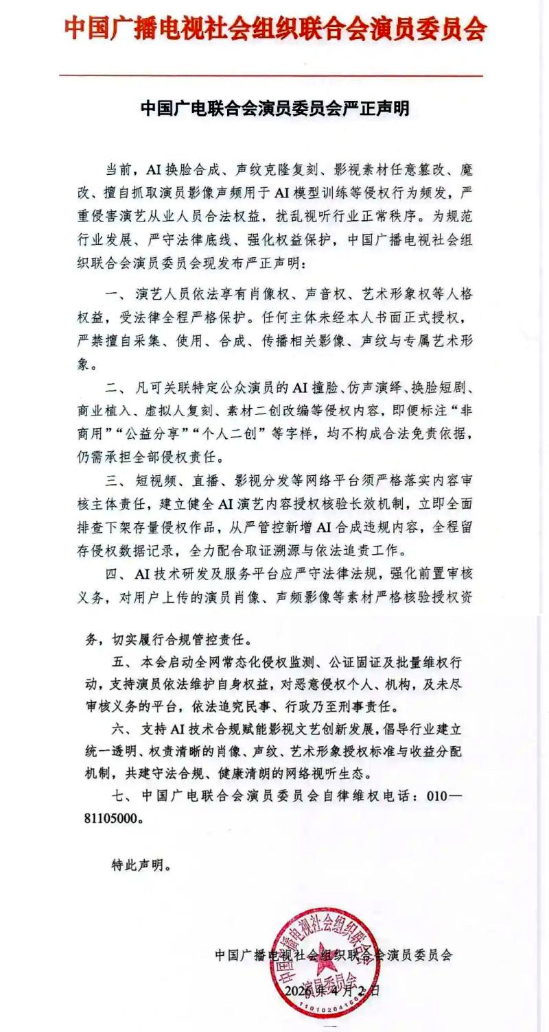 针对当前频繁出现的AI换脸合成、声纹克隆复刻、影视素材任意篡改魔改、擅自抓取演员影像声频用于AI模型训练等侵权行为,4月2日,中国广播电视社会组织联合会演员委员会(简称:中广联演员委员会)发布严正声明,强调依法维护演艺人员合法权益,任何主体未经本人书面正式授权,严禁擅自采集、使用、合成、传播相关影像、声纹与专属艺术形象。