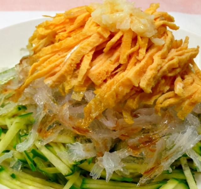 原料:黄瓜、鸡蛋、洋菜、蒜泥、麻油、盐、黑胡椒、水、醋。