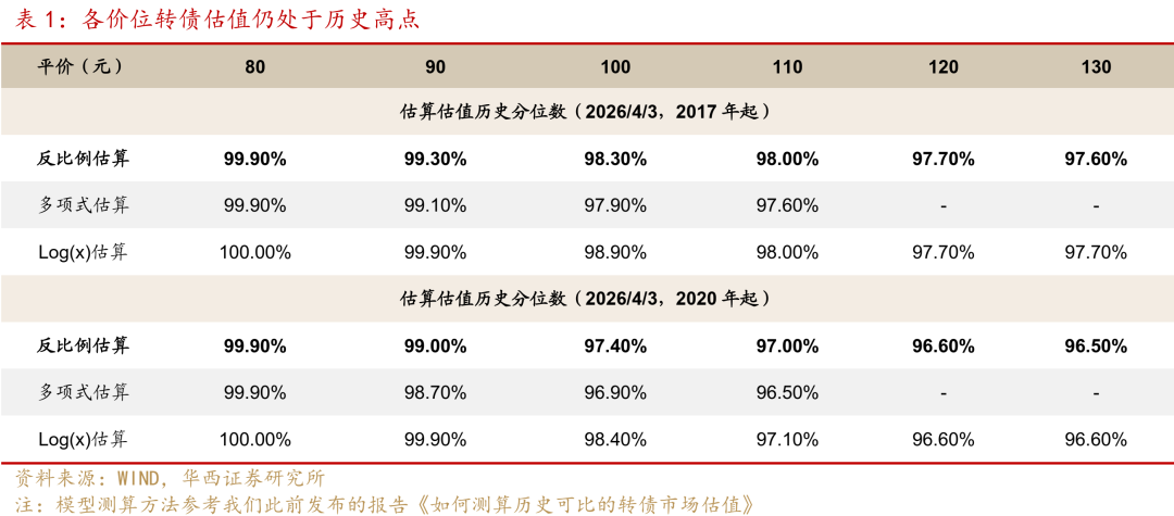 3月30日-4月3日,偏债型转债估值回升,偏股型转债估值继续压缩。截至2026年4月3日,80元平价对应的估值中枢60.01%,较3月27日上升0.96个百分点;100元平价对应的估值中枢为39.66%,环比下降0.16个百分点;130元平价对应的估值中枢环比下降1.20个百分点,至20.88%。此外,本次测算结果剔除了纯债溢价率小于-5%的样本,这主要考虑到2024年5月之后市场对信用风险的担忧加重,部分弱资质&低平价的个券估值出现异动,很大程度上影响了模型的拟合效果。
