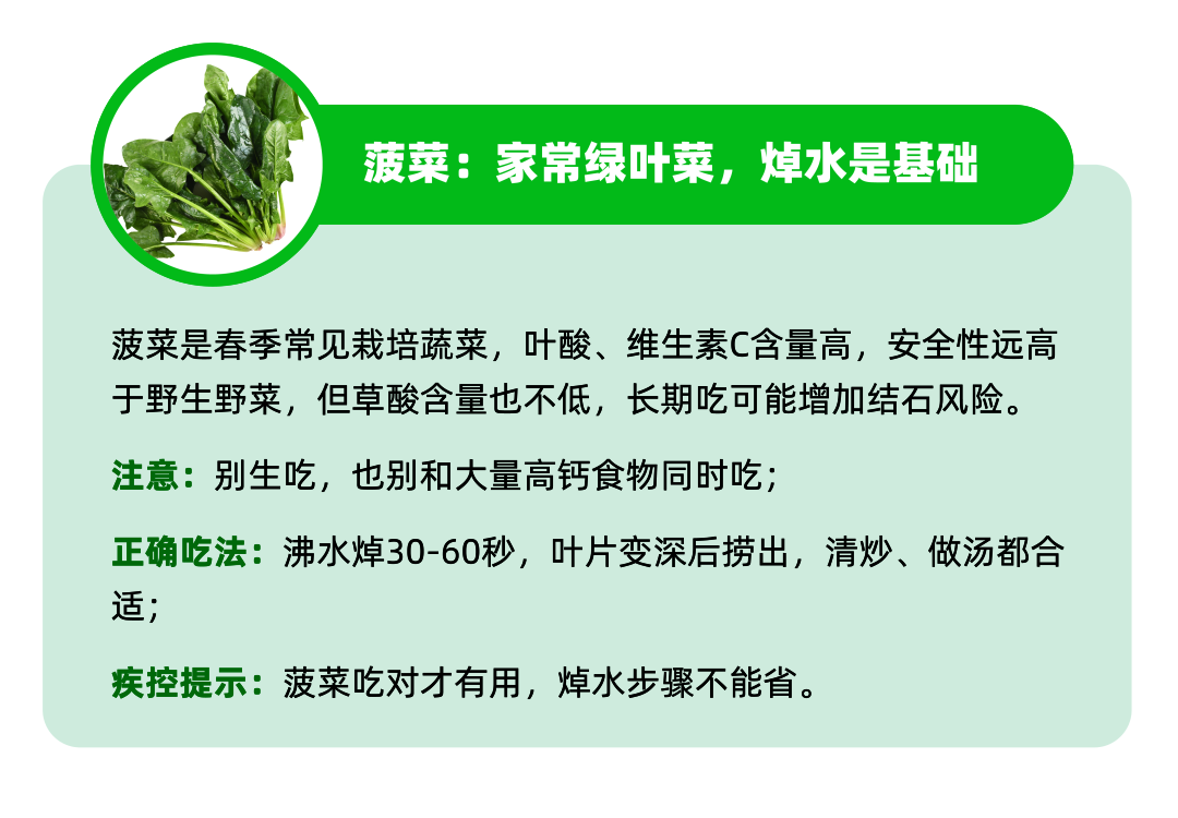 菠菜是春季常见栽培蔬菜,叶酸、维生素C含量高,安全性远高于野生野菜,但草酸含量也不低,长期吃可能增加结石风险。