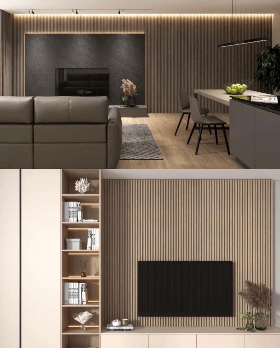前几年木格栅背景墙火得一塌糊涂,竖条的木条一根一根排开,有层次感,有竖向拉伸效果。