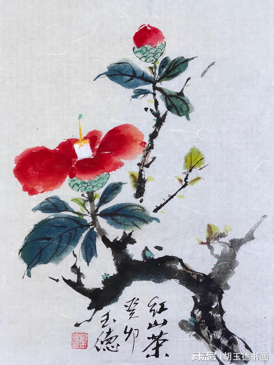 在丰富多彩的国画艺术领域中,小写意绘画以其独特的笔墨韵味和灵动的表现形式深受广大艺术爱好者的喜爱。今天,我们要聚焦于一幅别具特色的《山茶花》国画小写意课稿,它出自胡玉德老师之手。