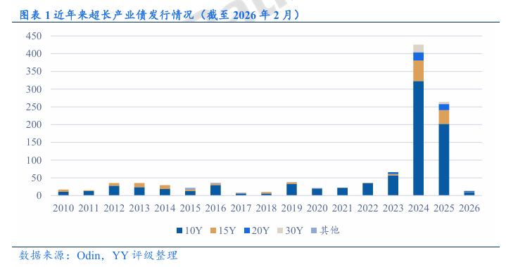 这一现象与2023年以来利率中枢持续下移、“资产荒”格局深化密切相关。在收益率极限压缩同时收益率曲线趋向平坦化背景下,发行人和投资者的久期诉求呈现双向契合。从发行人角度看,长端利率已处于历史低位,在当前时点提前锁定长期资金成本具有战略价值;同时,部分大型企业为匹配长期项目投资或优化债务结构,本身存在发行超长债的刚性需求。从投资者角度看,对于保险、养老金等负债久期较长的配置型机构,在短端收益持续走低的“资产荒”环境中,拉长久期成为获取票息收入和潜在资本利得的重要途径。供需双方的共同推动,促成了近年来超长债供给的持续放量。