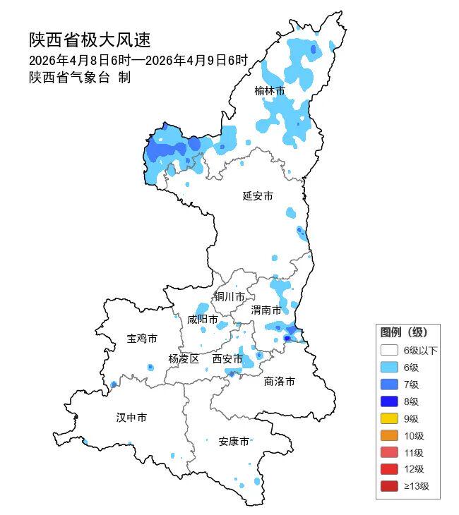 预计今天白天到晚上陕北、关中北部、秦岭山区有6级以上阵风,局地可达8级。