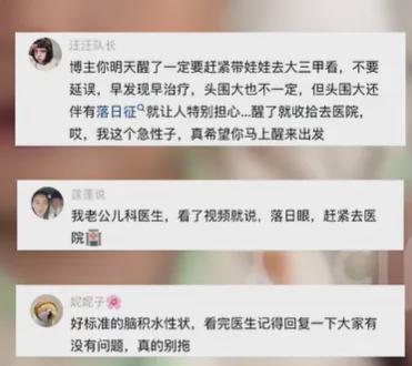 有网友明确表示,“这是很标准的脑积水症状”,还有网友留言称,“我老公是儿科医生,看了视频就说孩子有落日眼”,落日眼正是脑积水的典型症状之一。