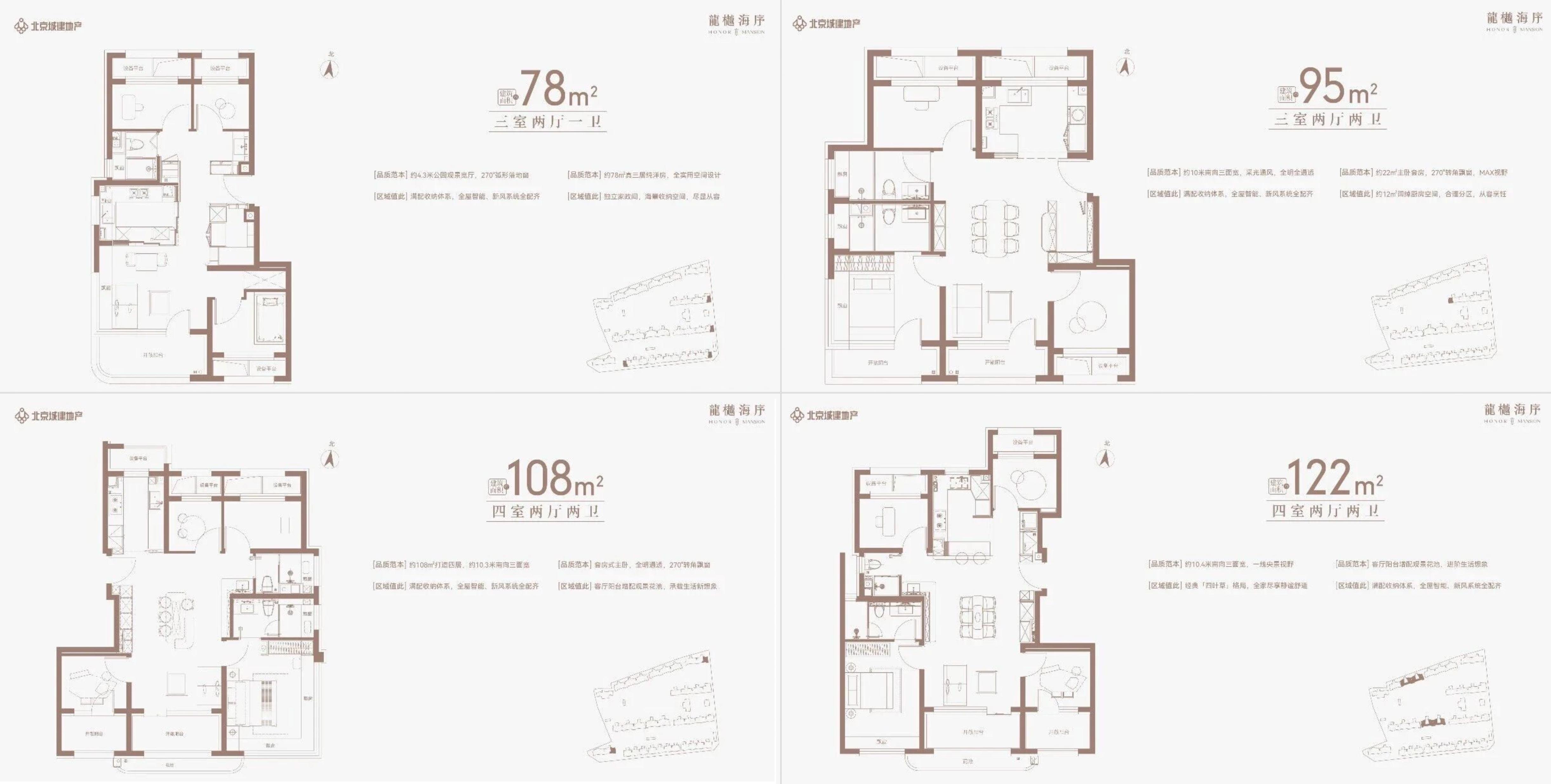 四个主力面积段:78/95/108/122㎡,另有少量68/82/103㎡户型。