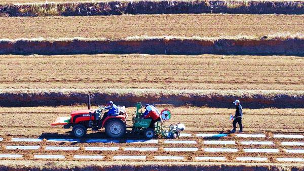 李家店村的春日田野,是自然与人文碰撞的绝美画卷。连绵的丘陵被开垦成错落有致的梯田,每一道田垄都顺着山势蜿蜒,宛如大地舒展的脉络。覆膜机驶过之处,银白的地膜严丝合缝地覆盖在土壤表层,在暖融融的春光下泛着温润的光泽,与红褐色的耕地形成鲜明的色彩对比,勾勒出规整而富有韵律的图案。近处,拖拉机牵引着播种设备,农机手专注地操控着方向,设备精准地完成开沟、播种、覆土、覆膜的全套工序;田间,工作人员手持工具细致检查覆膜质量,脚步踏过田垄,留下一串串踏实的印记。远处的山峦层峦叠嶂,草木初萌,红顶的村落点缀在田野边缘,为这幅壮阔的农耕图景增添了几分温馨。这样的画面,既是农耕文明的质朴写照,也是现代农业与自然地貌完美融合的艺术呈现。
