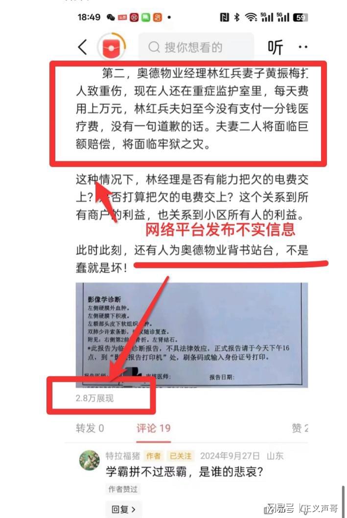 小区业主崔某玲、鞠某霞还捏造事实、进行网络诽谤,2024年9月25日,二人在相关平台及500人小区群散布谣言,谎称林红兵夫妇打人致重伤、伤者入住ICU每日花费万元,还附带伪造的诊断报告,造谣二人将面临巨额赔偿与牢狱之灾。截至2026年1月,该不实信息展现量高达2.8万次,远超诽谤罪“情节严重”的5000次浏览门槛,已涉嫌相关违法,却依旧未被立案查处。