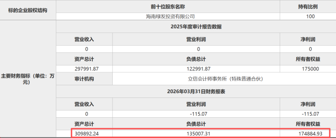 根据披露信息显示,三亚绿发房地产有限公司为海南绿发投资有限公司100%持股的子公司,截止2026年3月31日,该公司资产总计30.98亿元,负债总计13.5亿元,所有者权益17.48亿元,从财务指标来看,是一宗优质资产。