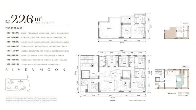 226㎡复式六房四卫:最高赠送约 68㎡,实得超 270㎡,独立电梯厅 + 动静分区,顶豪尺度尽显尊崇。得益于新规报建与搭板设计,飘窗、设备平台不计面积,户内花园半计面积,让每一寸空间都物超所值,大幅降低改善购房成本。