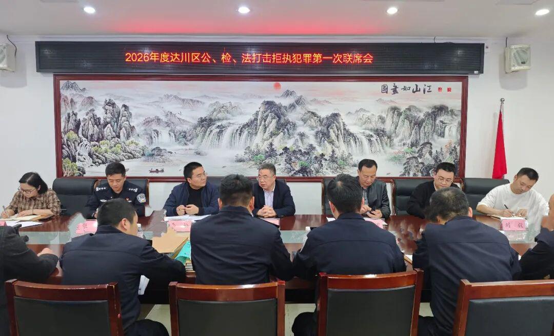 为切实破解执行难题,有力保障当事人胜诉权益,4月9日,2026年达川区公、检、法打击打击拒执犯罪第一次联席会在达川区法院召开。会议由达川区法院党组成员、副院长屈燊主持。三部门相关分管负责同志、业务骨干及办案干警参加会议。