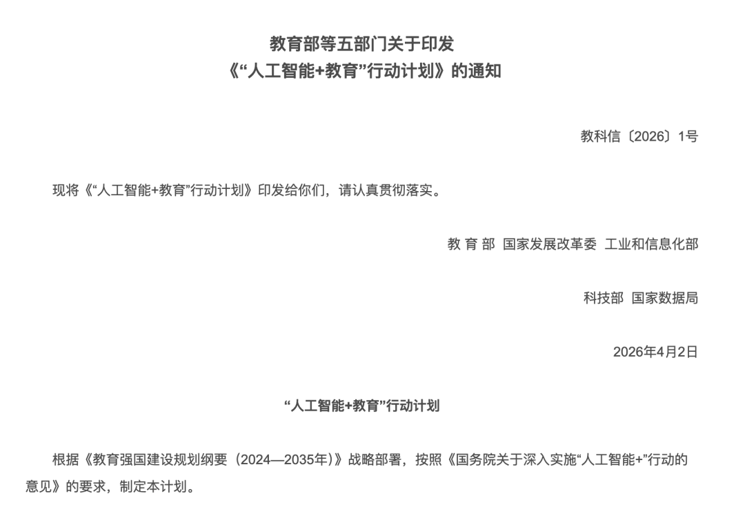 2026年4月2日,教育部官网正式对外公开了一份重磅文件:教育部等五部门关于印发《“人工智能+教育”行动计划》的通知。