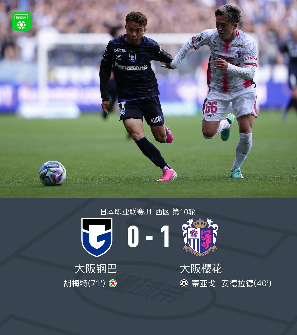 北京时间4月11日日本职业联赛J1 西区 第10轮,大阪钢巴主场对阵大阪樱花。大阪樱花蒂亚戈-安德拉德破门。最终比分大阪钢巴 0-1 大阪樱花。
