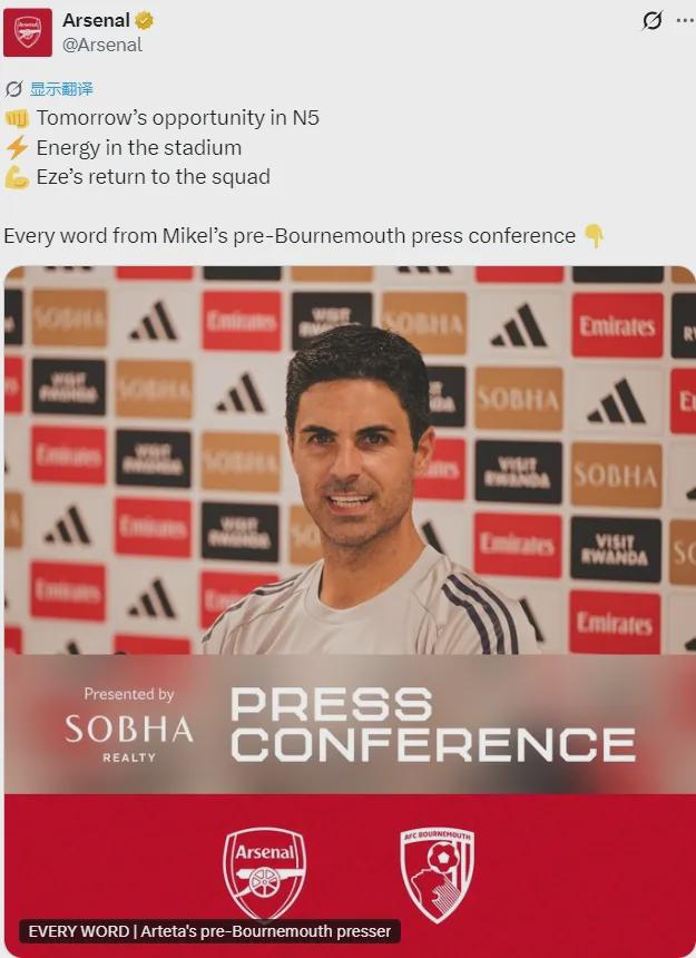 阿尔特塔出席了赛前新闻发布会,我们来看阿森纳主帅的发言。