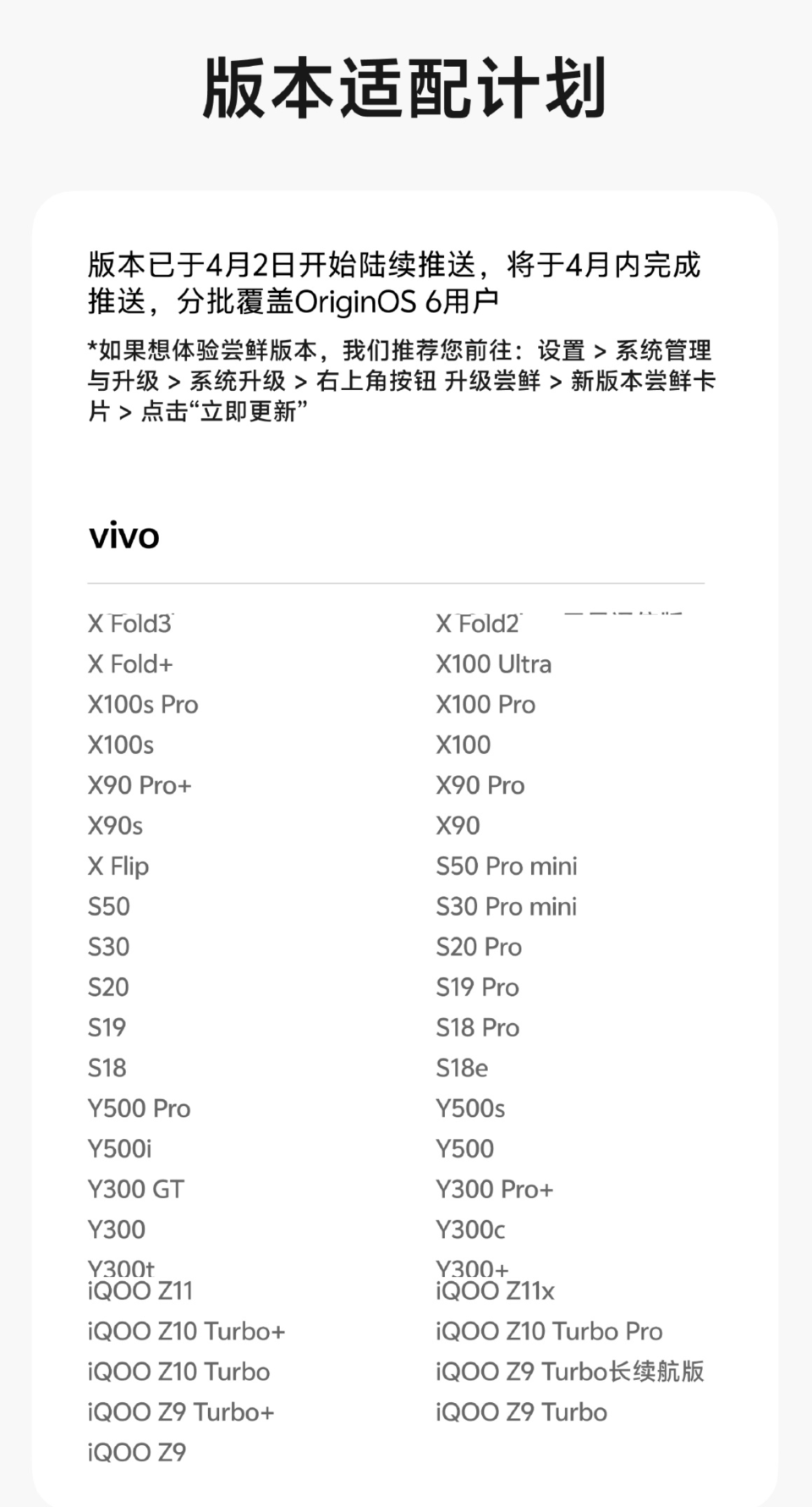 该版本已于4月2日开始陆续推送,将于4月内完成全量推送,所有已升级至OriginOS 6的上述机型用户均可收到更新。