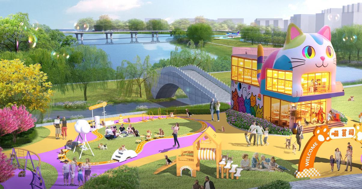 萌宠共生,趣味交流——在公园里建造萌宠营,用于喜爱宠物的人交流的驿站建筑,成为爱宠人士的欢乐据点。