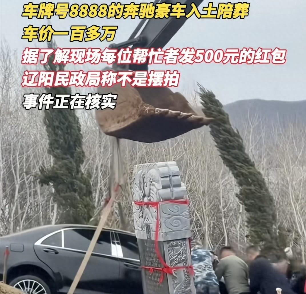 车顶覆盖着刺目的大红绸布,车牌辽K8888B四个“8”字连缀成串,在春日阳光下泛着冷光;挖掘机随即轰鸣启动,黄褐色泥土如潮水般倾泻而下,顷刻间吞没整台豪车,将其彻底封存于地下,成为逝者“专属座驾”的终极归宿。
