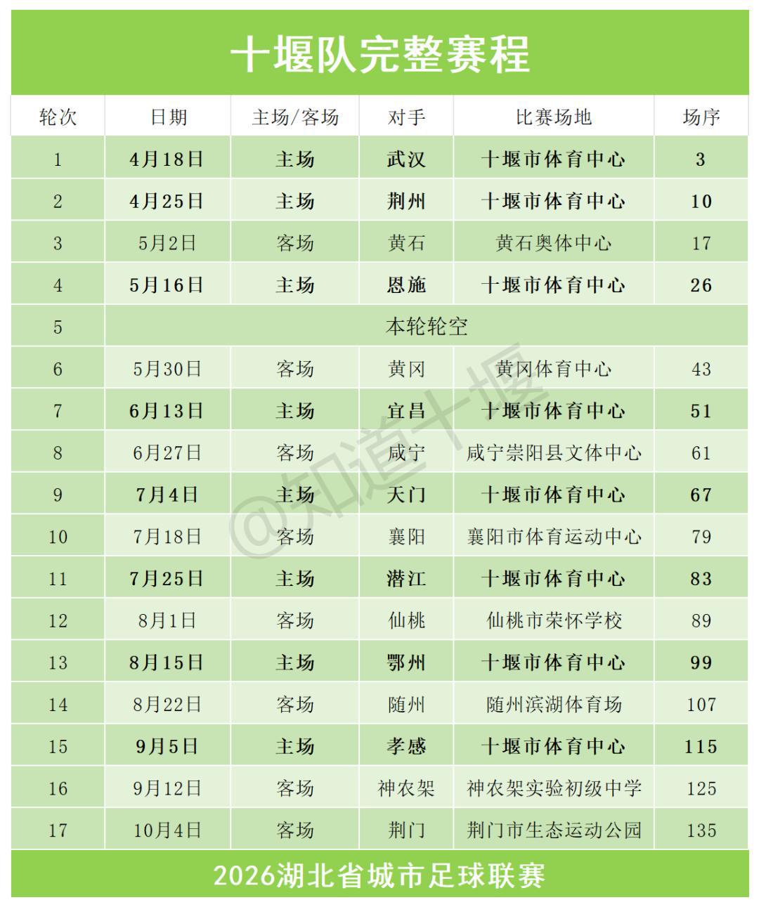 赛程信息:4月18日,武汉队将在十堰客场迎来首战。主场首战在5月4日,武汉队对阵咸宁;5月24日对阵襄阳,迎来“汉江德比”;后续依次对阵仙桃、随州、神农架、荆州、恩施、黄冈等对手。