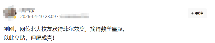 时值2026年4月份,在北大校友圈传来了消息说“网传北大校友获得菲尔茨奖”。