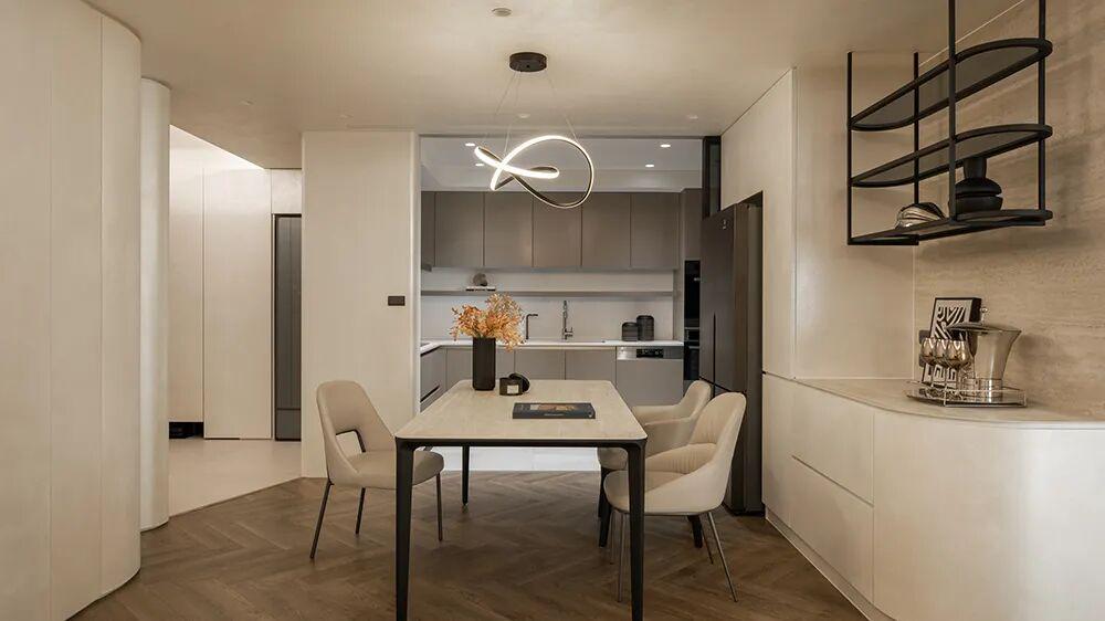 全屋独家调和的御柔色手工涂料,温柔又耐脏,根本不怕娃造!天花板做了湖泊感有机曲线,没有一点尖角,对小孩、猫咪都超安全。挑高户型 + 隐藏式软条灯,光从缝隙里流淌出来,白天看天光,晚上暖灯一开,治愈感直接拉满!