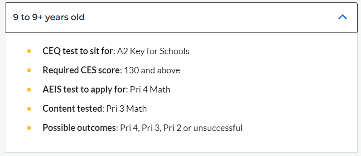AEIS一年两回,上半年二三月,下半年九月,马上要来的这场是9月考,预计7月报名。但这里有个前提,那就是只有拥有合格的CEQ,才有机会报考AEIS。且不同年级考AEIS,对CEQ分数的要求不一样。