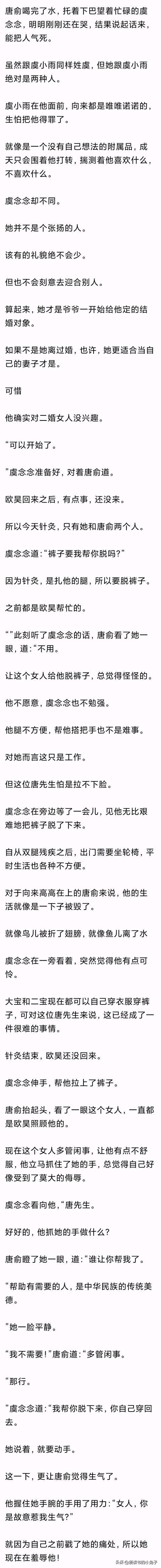 唐俞没出声,虞念念又继续说:“你腿现在残疾,但内心更自卑。别人对你一点关爱,你都会理解成对你的侮辱,你因此生气,我有说错吗?既然如此,我说你脑子需要瞧瞧,有问题吗?”