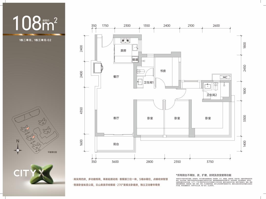 空间奢阔静谧舒居,全南向客厅及卧室;公卫干湿浴三分离,主卧270°巨幅视野