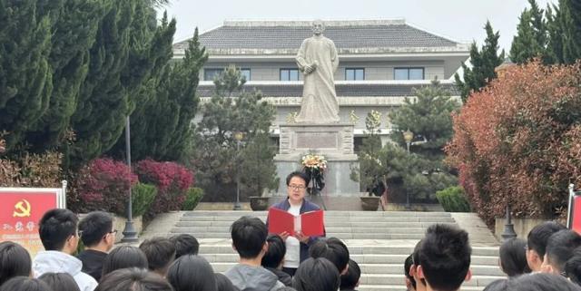 在鲜红的党旗、团旗下,全体党员面向党旗、全体团员面向团旗高举右拳,庄严宣誓。铿锵有力的誓言回荡在纪念广场,彰显着新时代师生坚定的理想信念和忠诚担当。