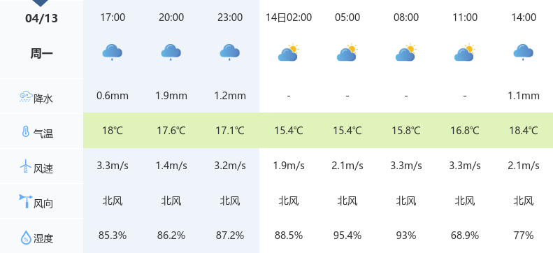 未来三天,仙桃以小雨和多云交替为主:4月14日白天小雨、夜晚多云,4月15日白天小雨、夜晚小雨,4月16日白天多云、夜晚晴,气温逐步回升,最高气温由18℃升至23℃,最低气温由13℃升至16℃,各日风力均为微风。连续降雨易导致低洼路段积水,建议市民关注短时临近预报,避免在涵洞、桥下等易积水区域长时间停留。