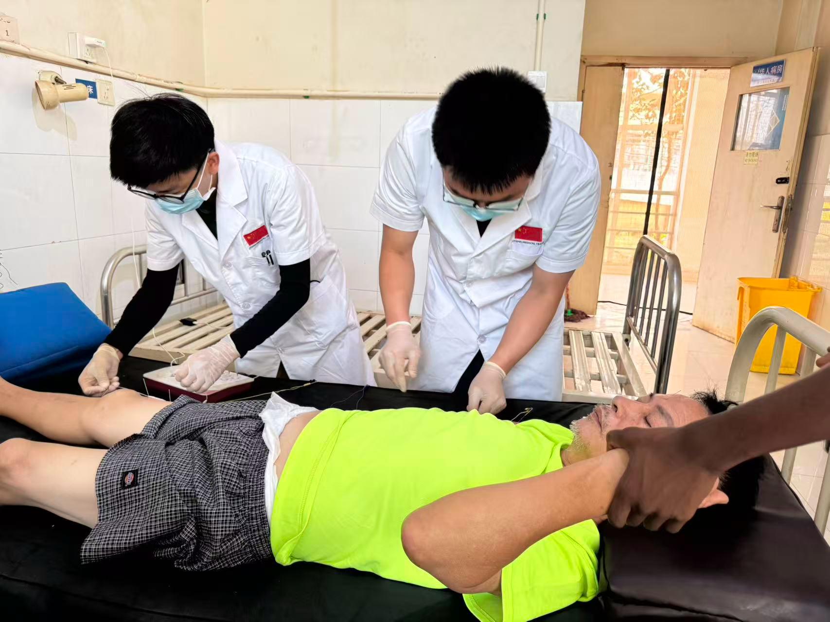 为了让老张尽早恢复功能,在有限的治疗条件下,中医科周胜强与李端丹医生迅速介入。在简陋的病床上,他们采用调衡针灸法精准施治。在这种多学科的联合救助下,老张原本僵硬的肢体开始有了微弱反馈,失语的嘴唇也渐渐能发出声音。