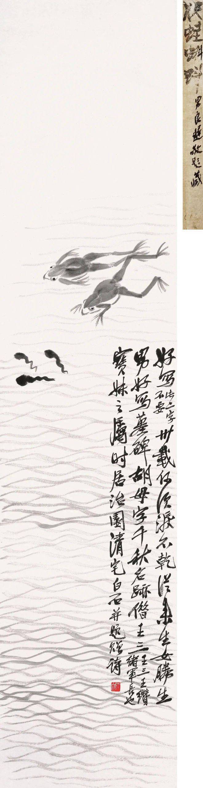 ▲齐良迟题签旧藏齐白石作品《双蛙蝌蚪》·中国齐白石书画院展览(齐白石版权拥有者)·少白公子汤发周供图