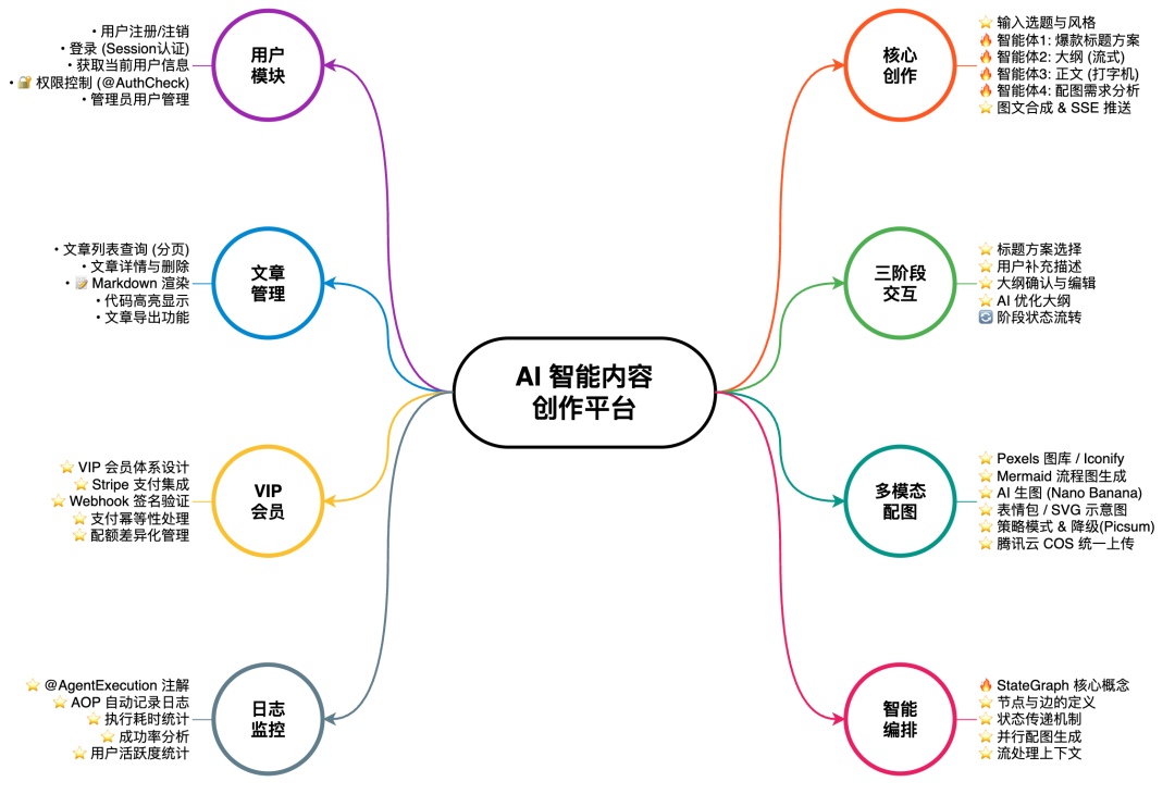 该项目功能丰富,涵盖用户系统、文章创作、多智能体编排、配图服务、VIP 会员支付、统计分析 6 大模块,20+ 功能点,覆盖了从 AI 多智能体协作、策略模式扩展到国际支付的完整企业级 AI 应用开发流程。