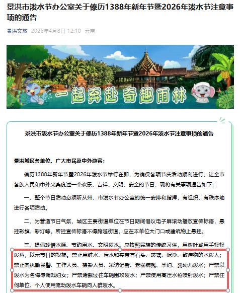 4月14日,西双版纳州文旅局回应:事件已如实上报调查,相关部门持续跟进。此外,泼水广场是官方集中活动区域,执法和保障人员充足,建议游客优先去指定区域玩。