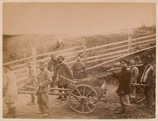 20 世纪初沙俄统治库页岛时期,苦役犯修建道路。地面散落的原木、木桩支护,以及依山而建的土方工程,证明了这是一项艰苦的基础建设工程。沙俄为了开发库页岛,修建了多条简易道路和设施,而这些工程完全依赖苦役犯的廉价甚至无偿劳动力。