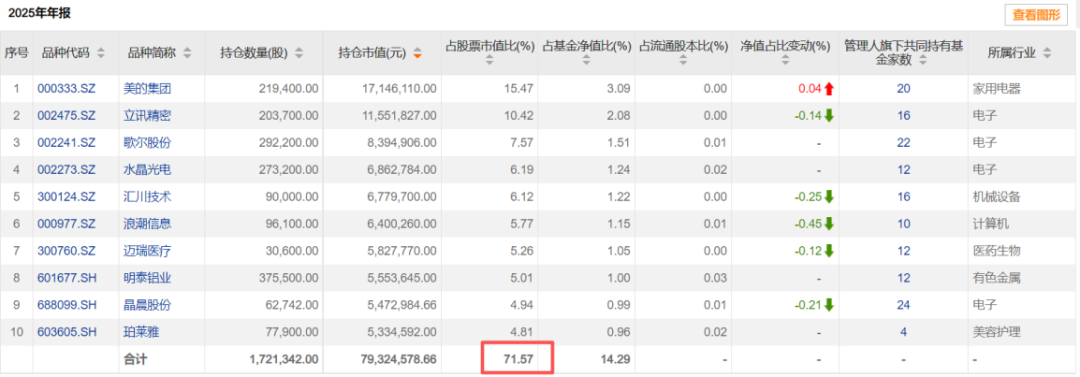 2025年末,其前十大重仓股合计占基金净值的比例为14.2%,但占整个股票市值的比例高达71.5%。其中,第一大重仓股美的集团占股票市值的15.4%,第二大重仓股立讯精密占10.4%。