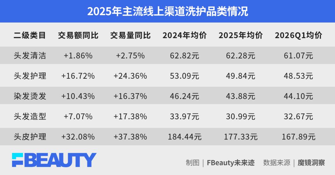 进入2026年第一季度,这一趋势仍在强化。除基础清洁类目交易量微降外,其余品类交易额均保持增长,但均价进一步下探。这清晰地指向一个结论:在主流电商平台,洗护消费已进入高频次、高性价比驱动阶段,消费者愿意尝试更多,但对价格愈发敏感。