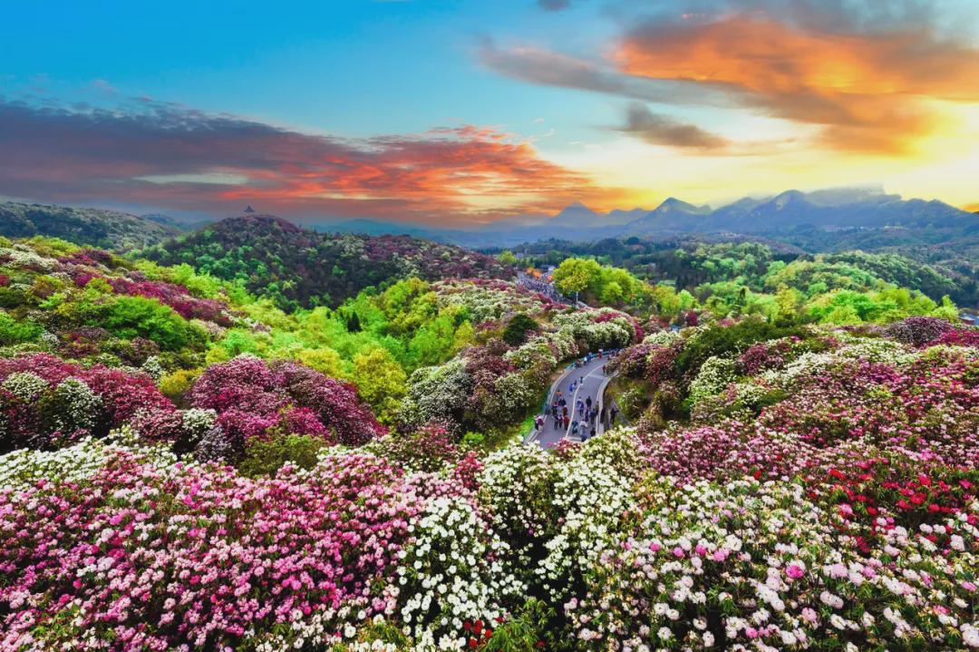 绵延一百多里的天然杜鹃林长在崇山峻岭之间,60多种杜鹃依次开放,红的热烈、粉的温柔、紫的梦幻、黄的明快,各种颜色的花一层叠一层地铺满了山峦,从山脚一直开到山顶,形成了被称为“地球彩带”的震撼景象。
