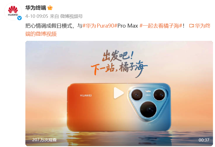 4月10日,华为终端官方微博发布华为Pura 90 Pro Max宣传视频,并配上文案“一起去看橘子海”,橘子海为主推配色,同款焕新配色还有翡翠湖、霞光紫、晨曦金、曜石黑。