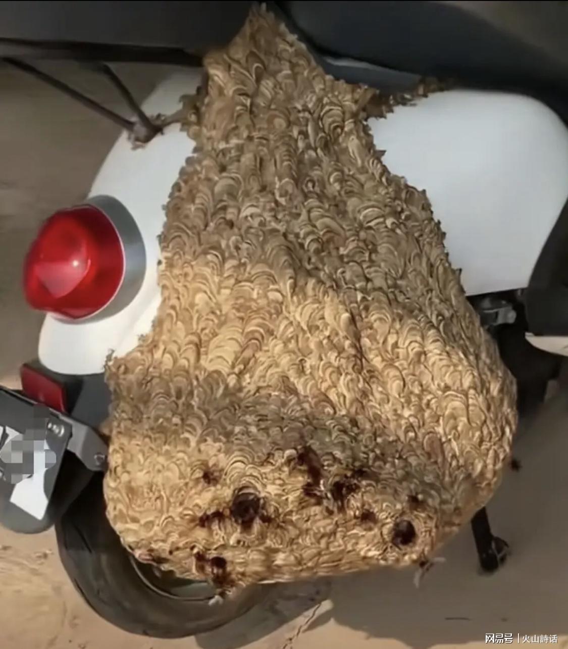根据该网友提供的图片,一辆电动摩托车上,一个巨型的马蜂窝在此安家。