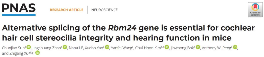 近 日,徐志刚团队在PNAS发表了题为 Alternative splicing of the Rbm24 gene is essential for cochlear hair cell stereocilia integrity and hearing function in mice 的研究论文, 报道了 Rbm24 基因 自身的 可变剪接 产生长、短两个蛋白亚型,影响不同靶RNA的可变剪接或稳定性, 在静纤毛发育和听觉转导过程中发挥了至关重要的作用。
