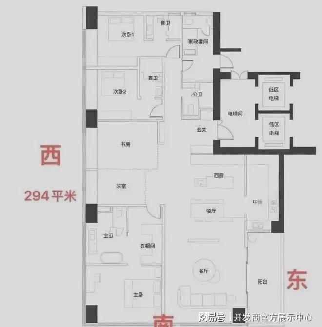 295㎡户型是整个中低区里面户型实用性最强,不仅能够做到4+1房的功能,还有单独的家政套间,设计了主仆双动线,相互的隐私都更好。