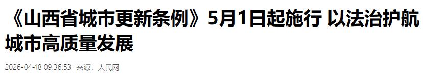 《山西省城市更新条例》将于5月1日起施行,以法治保障更新高质量推进。