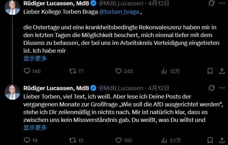 本周一,德国选择党议会党团国防政策发言人吕迪格·卢卡森宣布辞职。卢卡森的辞职阻止了原定于次日举行的针对议会党团国防工作组的党内不信任投票。