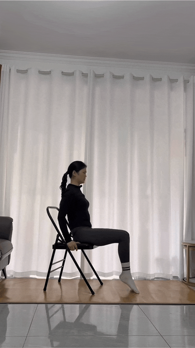 ·手撑在椅子两边,腿伸直可微屈膝,脚跟压地,呼气收腹依次抬腿向上